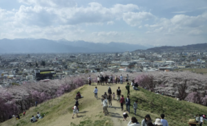 [長野・松本] 弘法山古墳 – 白銀に輝く山稜を望む桜に包まれた歴史の丘