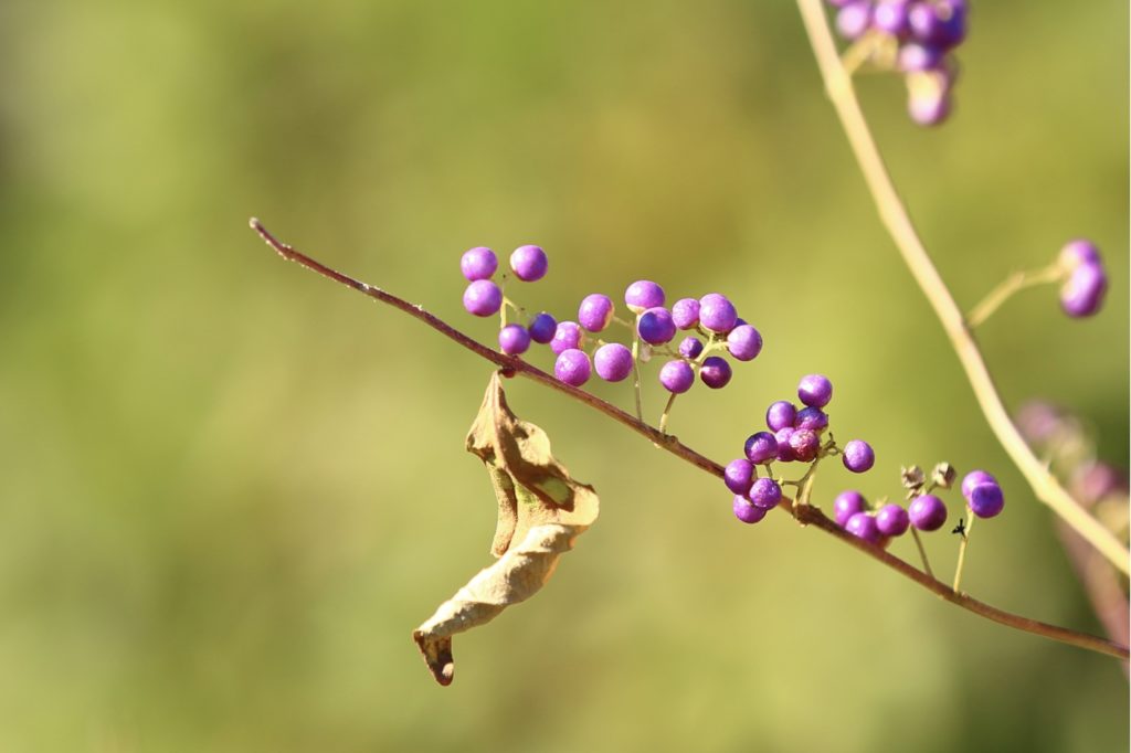 黄色の紅葉と、紫色の実の控えめながらも鮮やかな色のコントラストは、名前の由来の通り奥ゆかしさを感じます。